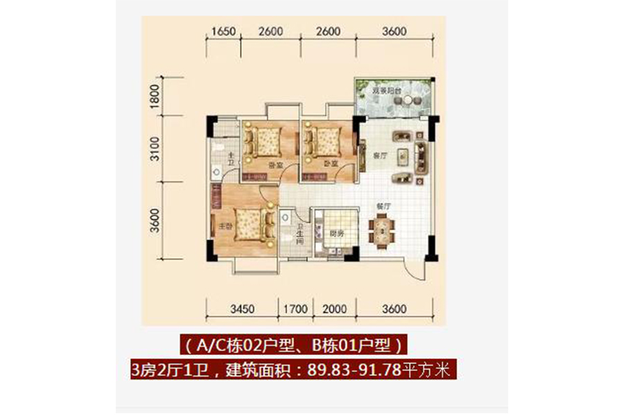 (A/C栋02户型、B栋01户型)3房2厅1卫,建筑面积:89.83-91.78平方米