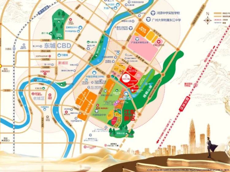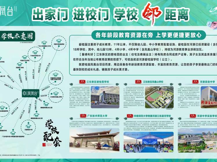 项目旁政府将规划建设54班中小学公立学校(该学校由我司同步代建建设移交政府部门),项目内配建一所幼儿园。南边临近江东新区碧桂园学校、北大附属德爱学校、河源中学实验学校、广州大学附属东江中学等,涵盖了从幼儿园至高中全龄化教育,助力孩子人生的每一步进阶。