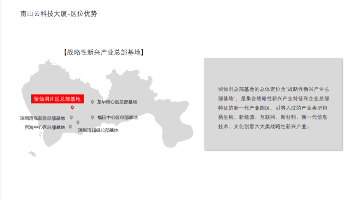项目位于留仙洞总部基地,该总部基地定位为“战略性新兴产业总部基地”,是集合战略性新兴产业特征和企业总部特征的新一代产业园区,引导入驻的产业类型包括生物、新能源、互联网、新材料、新一代信息技术、文化创意六大类战略性新兴产业。