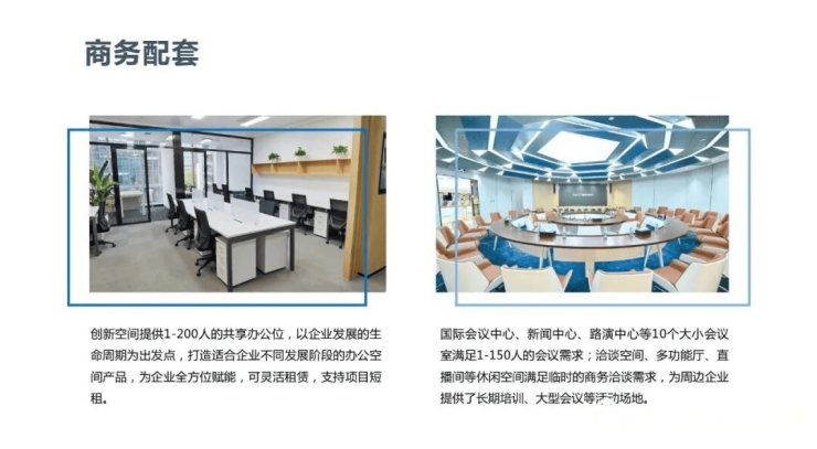 配备国际会议中心、新闻中心、路演中心等10个不同规格会议室,可满足1-150人规模的会议使用需求;洽谈空间、多功能厅、直播间等配套空间可满足各类临时商务洽谈需求,同时可为周边企业提供长期培训、大型会议等活动场地服务。