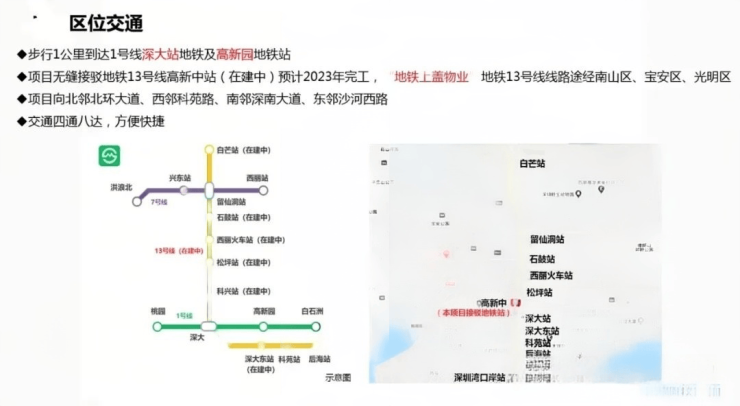 地铁站:1号线深大站A出口、13号线科兴站上盖物业;