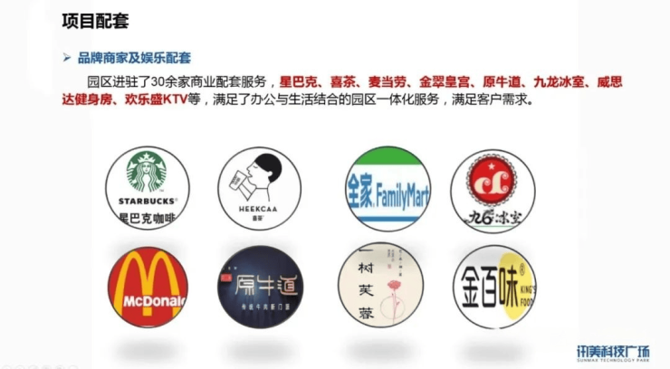 园区进驻了30余家商业配套服务,星巴克、喜茶、麦当劳、金翠皇宫、原牛道、九龙冰室、威思达健身房、欢乐盛KTV等,满足了办公与生活结合的园区一体化服务,满足客户需求。