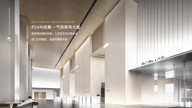 阔绰大堂:约14米挑高,建面约700㎡,甲级商务大堂,以尺度诠释企业气度;