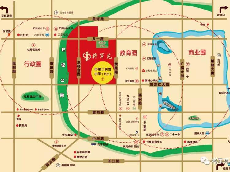 将军苑位于东方红西街以北,教场李庄以南、环城大堤以东,黄巢路以西,地处菏泽市牡丹区行政、经济、文化、教育、卫生的核心腹地。 交通便利