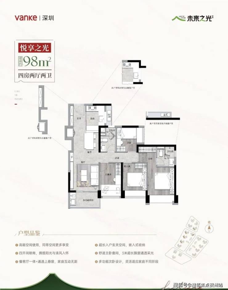 (3)98㎡四房两卫折后【约680-750万起】西南朝向,同等面积多1房!纯南向景观!