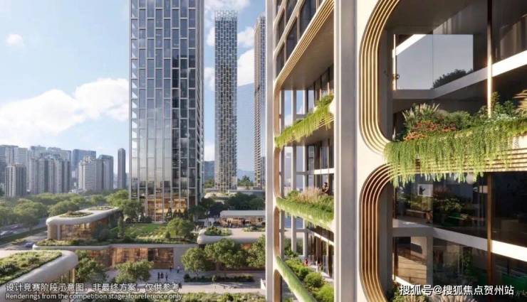 5月15日项目竞标方案显示,建筑外立面线条简洁硬朗,采用全玻璃幕墙设计,类似天鹅湖花园和红树西岸。中标方案采用全玻璃幕墙,效果图显示阳台明显,强调自然与居住融合,图中绿植丰富。