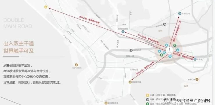 快捷交通路网,北环大道/南坪快速/侨香路/京港澳高速,20-30分钟到福田CBD、深圳北站、皇岗/福田/深圳湾三大口岸、宝安机场等,城芯而居,超享生活。