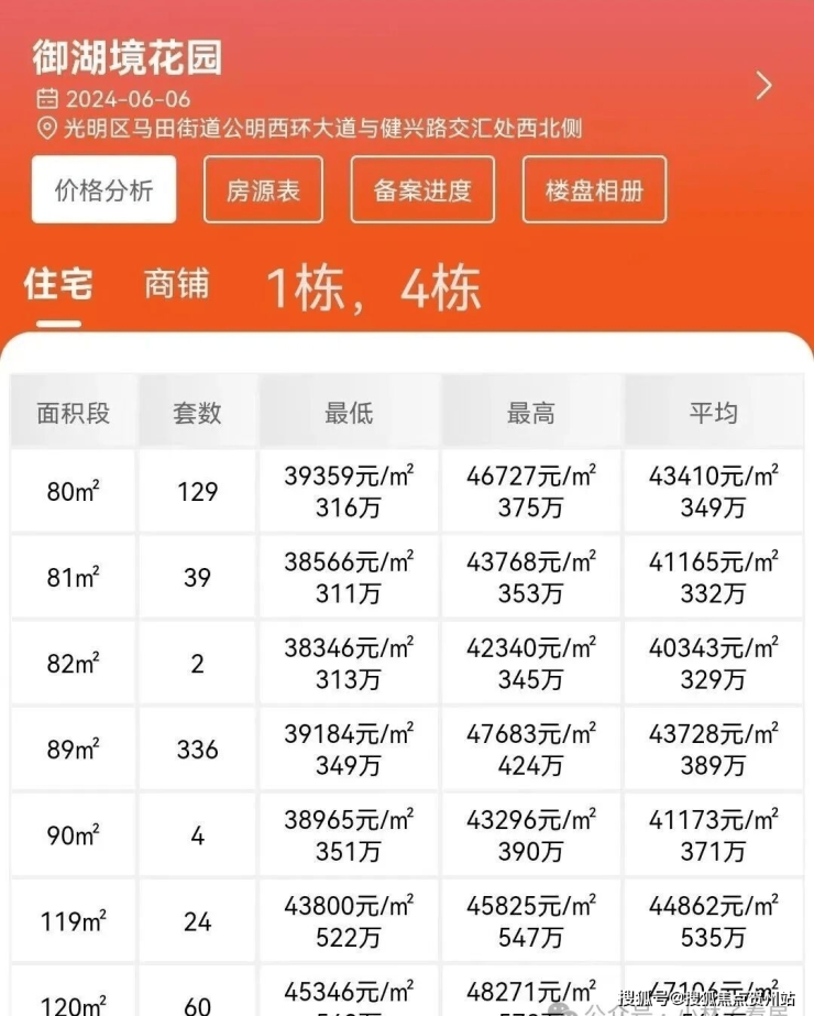 2024年6月6号加推了1栋,推出593套,面积80平-·20平,备案均价43847元,备案总价310万-578万,目前剩余82套,备案了511套,去化率86.17%。
