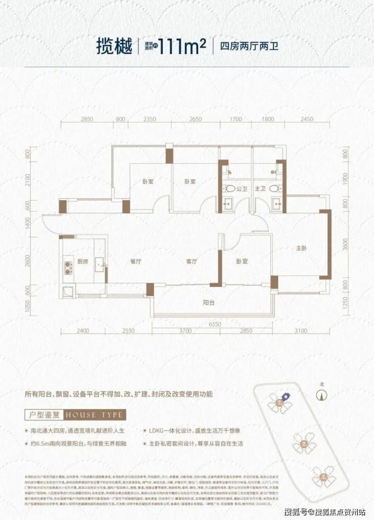 111㎡的4房2厅2卫,设计的是横厅南北通透格局,独门独户,进门入户玄关,客餐厅6.25米开间,LDKB一体化,全屋10面飘窗,主卧南北通,分别做到了主卧16.6㎡/次卧10.54㎡/次卧9.27㎡/次卧7.41㎡(包含墙体飘窗),U型厨房,卫生间干湿分离,得房率约102%(包含赠送),客厅连接次卧出6.55米长的大阳台,约10.8㎡主朝东南向。