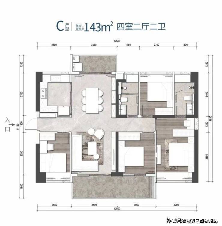 C户型 建筑面积约143㎡ 4房2厅2卫 东南 西北通大四房