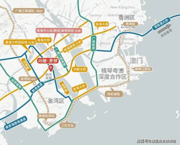 兴格·芳邻位于珠海重点发展的金湾航空新城板块,区域规划定位高端,产业基础雄厚(2024年金湾区规上工业总产值2748.41亿元)。项目周边机场、轻轨、高速、大桥等组成的立体交通网络,可轻松通达珠海全城。