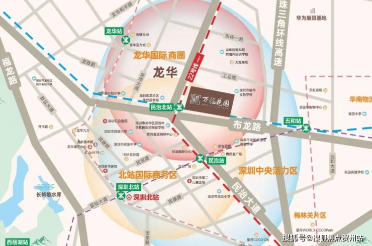万福花园位于龙华民治街道,布龙路与民治大道交汇处,距离深圳北站近约2.5公里,又位于龙华国际商圈内,依托时代发展,板块迅速崛起,项目所在的民治板块,作为深圳都市核心区的核心区域,是龙华“一圈一区三廊”中央活力区的核心区域,对标福田,南山,罗湖等中心区,集齐了总部经济、金融、科技、文化、购物、休闲、国际商务、创新、生态等功能。