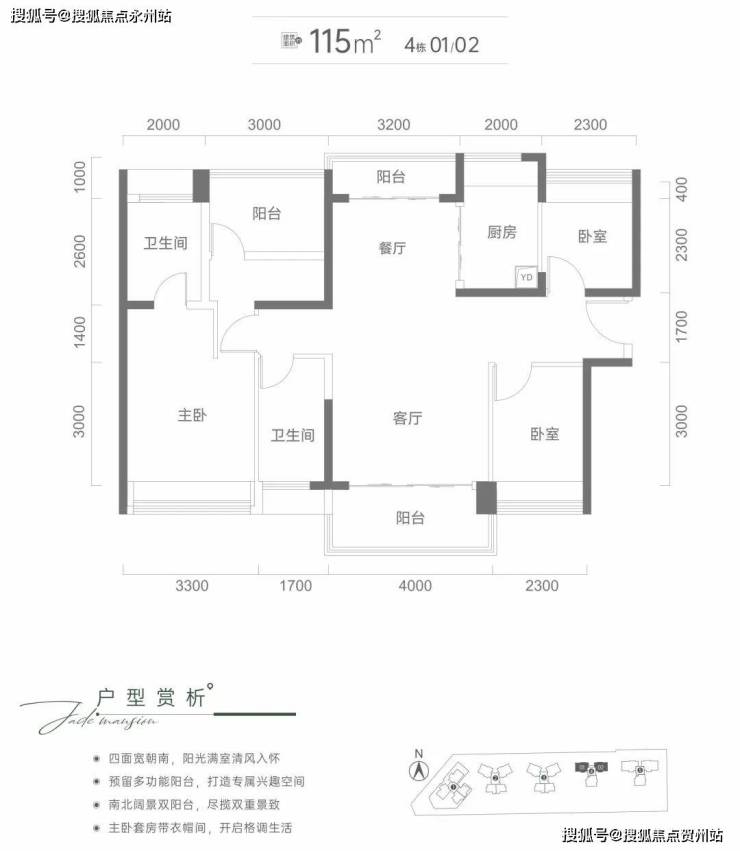 115平3+1房2卫:这个面积段是套数最多的,有四条腿、有两个户型。3栋两条腿对称,一个东南、一个西南朝向;4栋两条腿都是南北通透。这两个户型设计和布局都还不错,