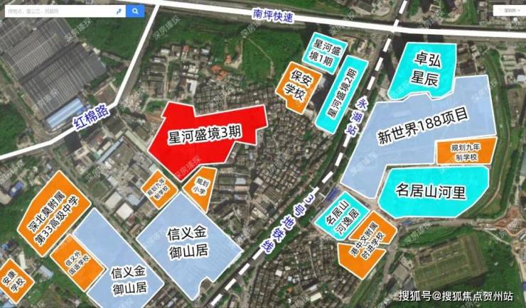 星河盛境3期,位于龙岗区横岗园山街道安红路与永湖路交汇处,项目前身为“龙岗区园山街道保安窝肚村城市更新单元”,南侧是信义金御山居(在建),西北侧约200米是信义玻璃厂,3号地铁线“永湖站”距离约400米