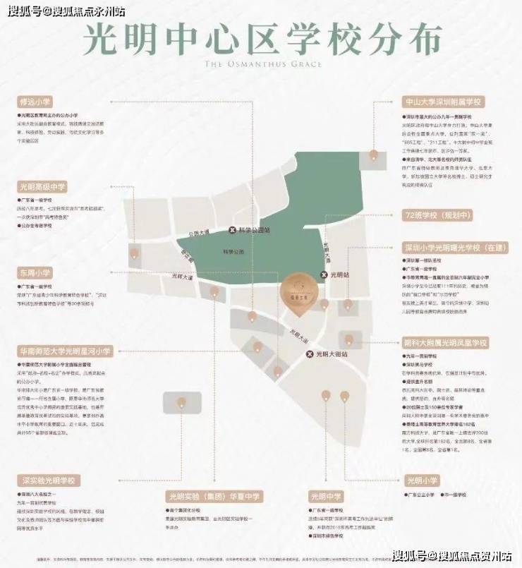 优质小学:项目北侧72班学校(在建,预计24年开始招生)、光明小学、深圳小学光明曙光学校(在建,预计24年开始招生)、华师大附小等