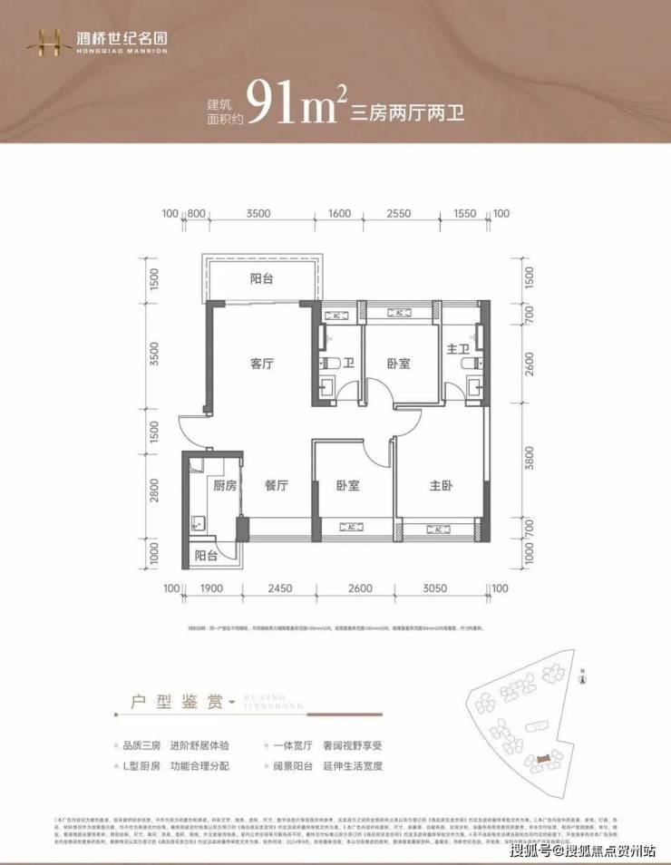 91㎡的3房2厅2卫:竖厅南北通透格局,客厅3.5米开间,LDKB一体化设计,3个卧室分别做到了3.05米/2.6米/2.55米的宽度,L型厨房带1个小生活阳台,卫生间干湿分离,阳台主朝正北向。