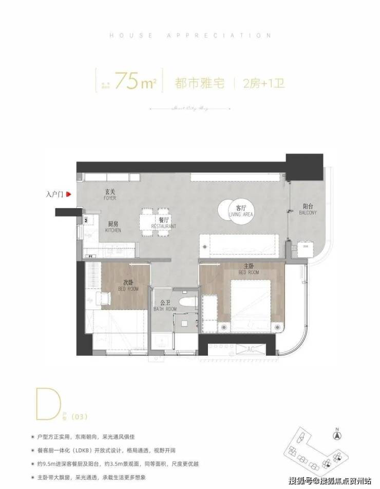 75-78㎡的2房1卫,金地环湾城入门级两房竖厅户型,户型方正实用,东南和西南朝向,采光通风良好,客餐厅一体化设计,通透明亮。