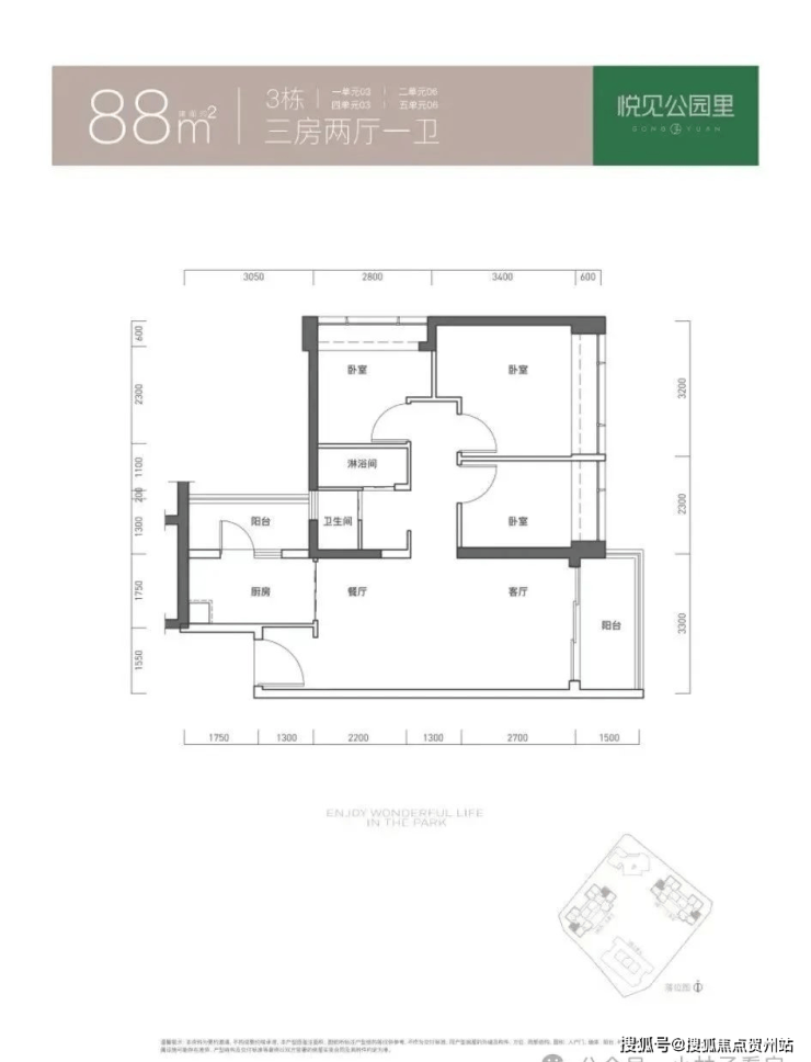 面积有85-88㎡的3房2厅1卫,91-94-95-97-110㎡的3房2厅2卫,120㎡的4房2厅2卫户型