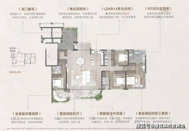 约62㎡墅级横厅铺陈约21.2米南向采光面,约130%极致实用率(不含电梯前室)重构约240㎡生活版图。约6米错层挑高空中会客厅悬浮于云端,于自然诗意中,启幕塔尖人生。