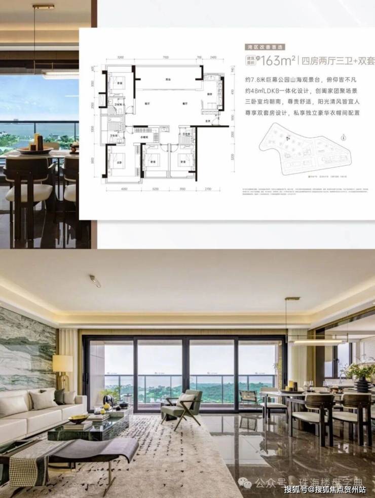 163平是两个客房,四房两厅三卫双套间的一个设计。入门进去就能感觉到户行最大的亮点,就是可以把整个中山公园景观搬到你家里面。山海景非常稀缺,还有远处深珠通道都能看得一清二楚,私密性又强。客厅户行的开间有7.7米,装进整个山湖和海景就像一个会客厅一样。
