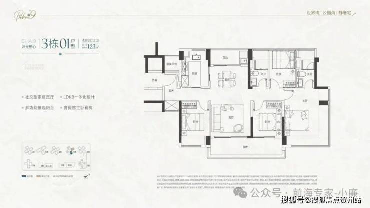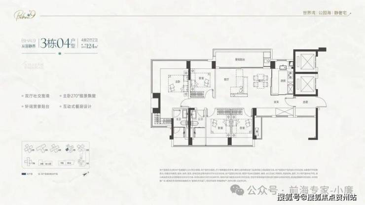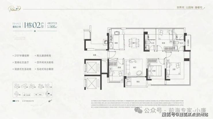 • 105㎡四房:竖厅南北通透,四开间朝南,主卧带270°转角飘窗,东南向阳台看海