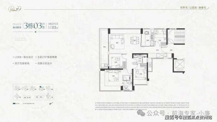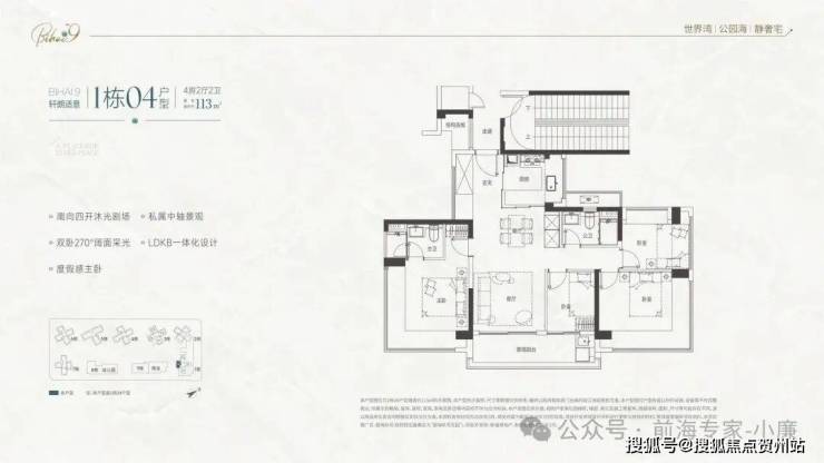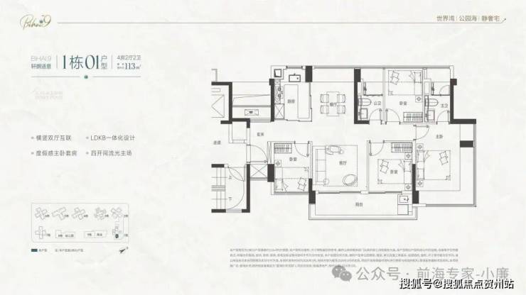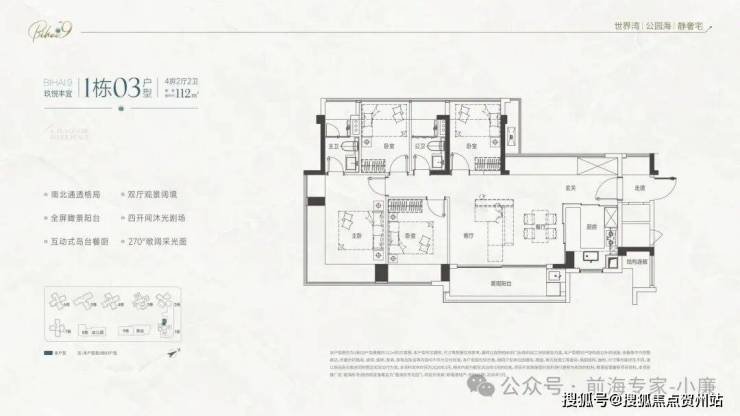 • 112㎡四房两卫:总价730-800万,四开间朝南,主卧带270°转角飘窗