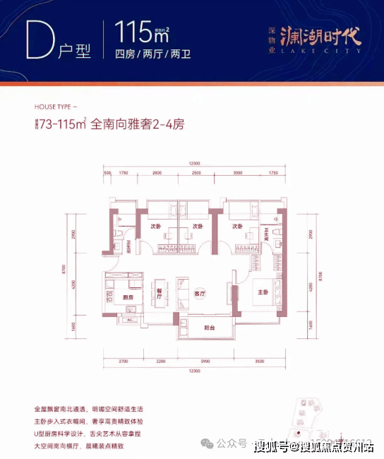 115㎡的4房2厅2卫,设计的是横厅南北通透格局,仅1单元01户型才有,客餐厅一体化6.1米开间,4个卧室分别做到了3.5米/3米/2.8米/2.5米的宽度,主卧套间设计,U型厨房,公卫三段式分离,得房率77-78%(不含赠送),阳台主朝东南向。