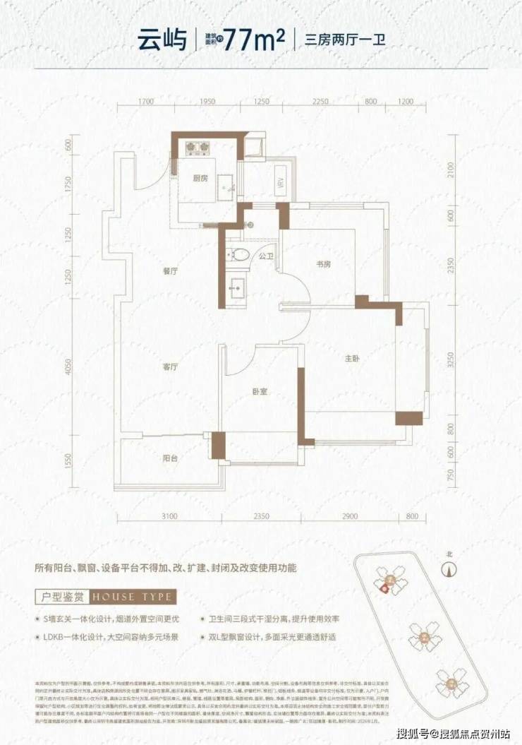 78㎡-3房2厅1卫,设计的是经典竖厅格局,客厅3.1米开间,LDKB一体化,S墙设计预留冰箱卡槽位,动静分区,三开间朝南,分别做到了主卧15.1㎡/次卧8.99㎡/次卧8.34㎡(包含墙体飘窗),U型厨房烟道外置,卫生间三段式分离,还带1个设备平台,得房率约100%(包含赠送),阳台约4.8㎡西南朝向。