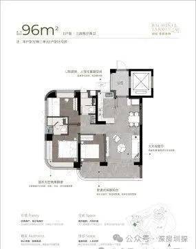 自贸·湾啟紫荆(原招商领玺4期),项目位于前海妈湾听海大道,占地约1.5万㎡,住宅建面约6.6万㎡,共485户,4梯5户,主推约96㎡稀缺三房、111㎡3+1房、122㎡四房、142㎡四房。