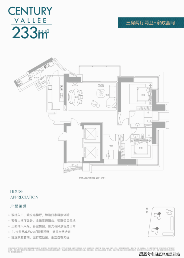 户型面积:240㎡、280㎡(3-4房)、380㎡(4+1房),梯户比为8梯3户,部分户型配备独立电梯