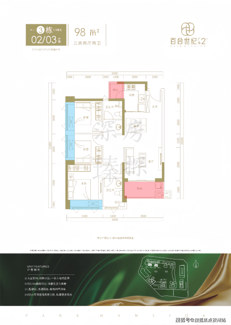 这次准备推售百合世纪广场二期(B-02地块),总占地面积约3.6万㎡,总建筑面积约27.03万㎡,计容建筑面积约19.38万㎡,容积率5.38,绿化率40%,共由3栋7个单元组成,总高是31-48层的住宅,其中1栋1单元住宅42F,1栋2单元住宅47F,2栋1单元住宅46F,2栋4/5单元住宅48F,3栋1/2单元住宅31F,另外2栋2单元公寓30F,2栋3单元商务办公楼22F,4栋是1所九班制幼儿园。