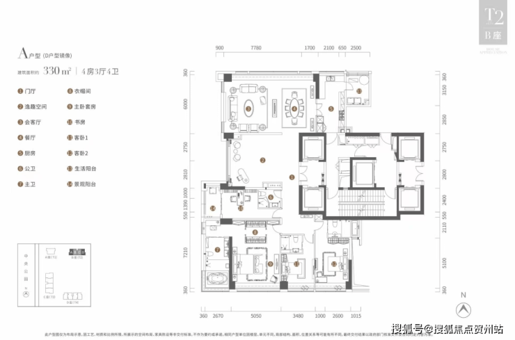 二、T4栋D东端头户型,面积330㎡,4+1房,备案总价3600万起;