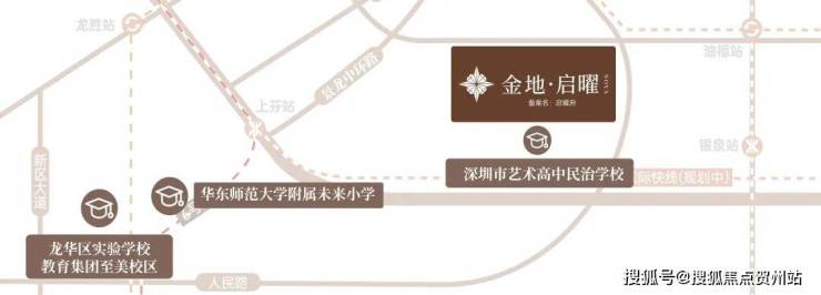 金地启曜,位于龙华区民治街道工业路与龙华人民路交汇处,项目东侧是同期在售的鸿荣源尚云花园,南侧是艺术高中民治学校,北侧是龙华商业中心城市更新单元,4号线“龙华站”距离约1公里,东南侧是龙华最大的商业中心-壹方天地购物中心。