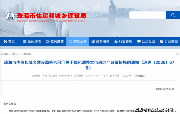 近期,珠海市住建局官网发布了《珠海市住房和城乡建设局等六部门关于优化调整本市房地产政策措施的通知(珠建〔2026〕57号)》。