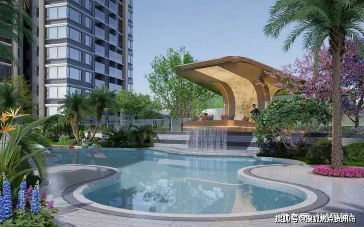 项目汲取宝格丽酒店的灵感,以曲线泳池、漂浮会客厅、景观叠水、休闲卡座、热带植物、儿童活动区、健身空间等,构建出更有互动感与停留感的社区景观。