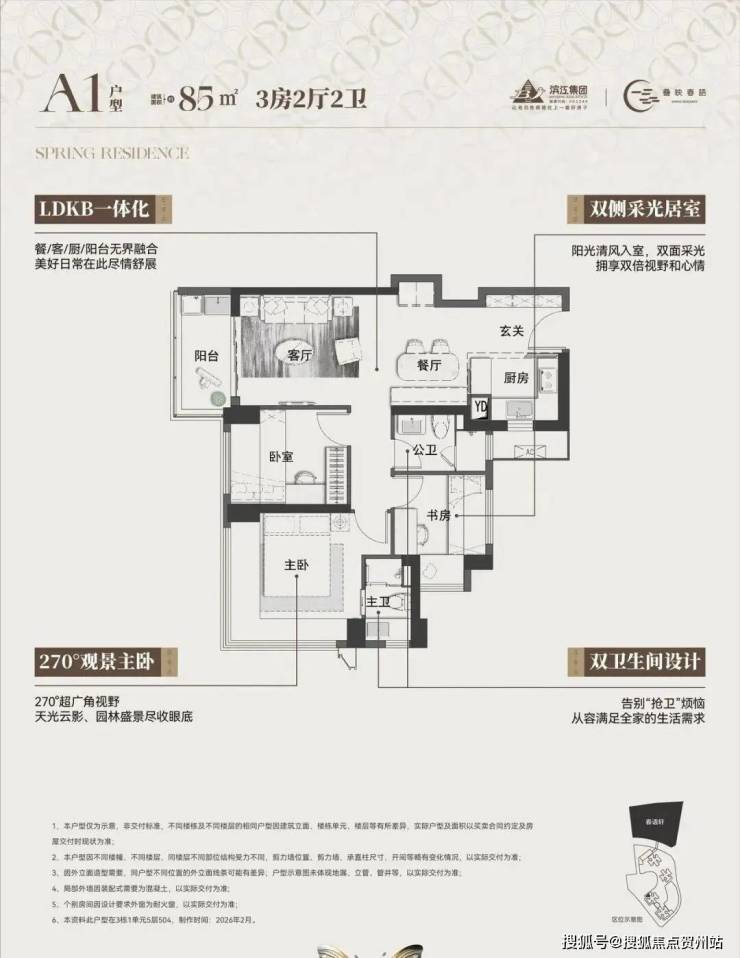 本次首推的主力中的主力。在85㎡面积段做到三房两卫,功能性极强。如果客厅开间能做到约3.3米,主卧带独立卫浴, 对房间数有硬性要求、预算在300-330万左右的家庭相当友好。