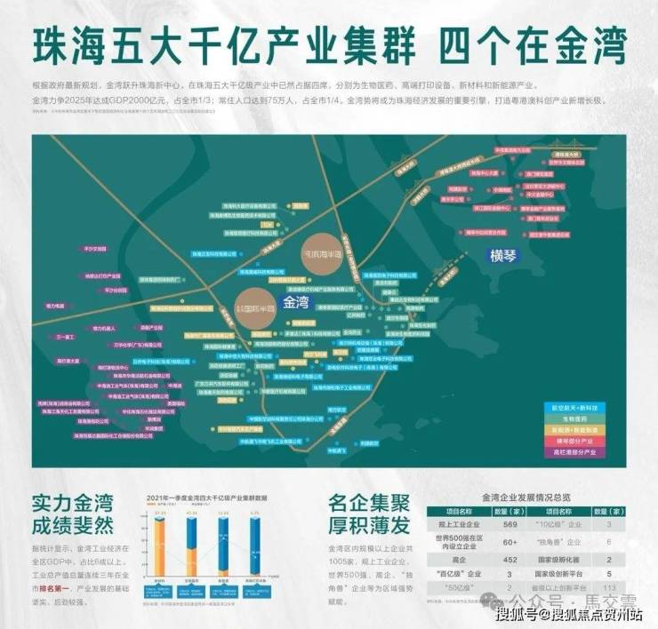 金湾打造四大千亿产业集群,成为粤港澳新兴高端产业增长极。2016-2020年,金湾生产总值增速珠海第一,现有高新技术产业451家。