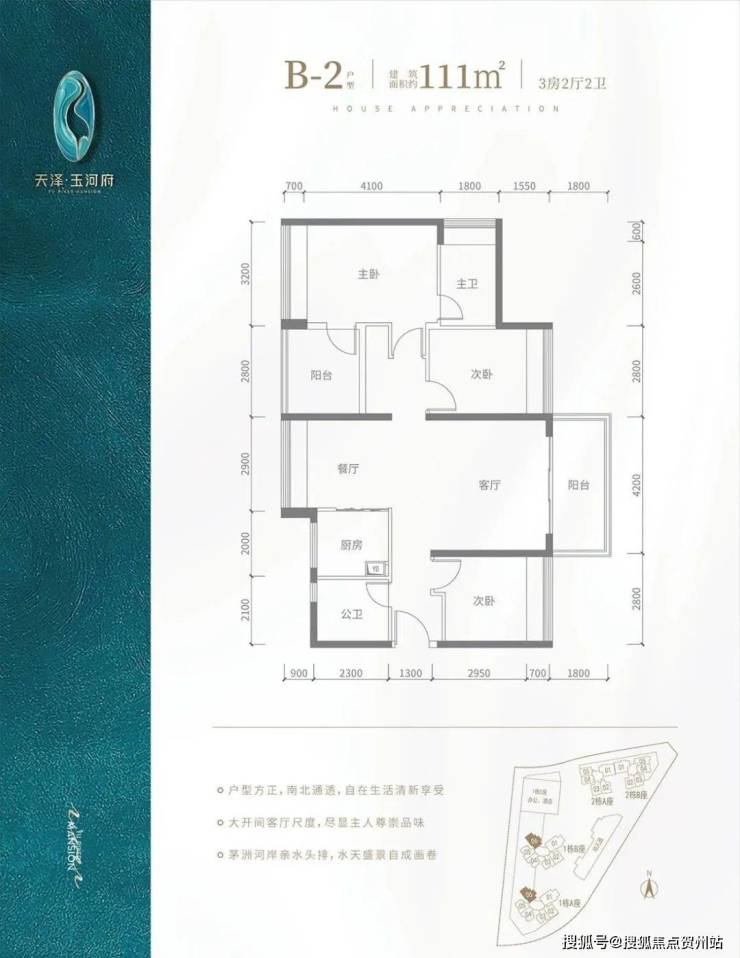 B2户型-111㎡-4房2厅2卫,设计的是竖厅南北通透格局,客厅4.2米开间,阳台主朝东北朝向,看花园景观,全屋飘窗设计。