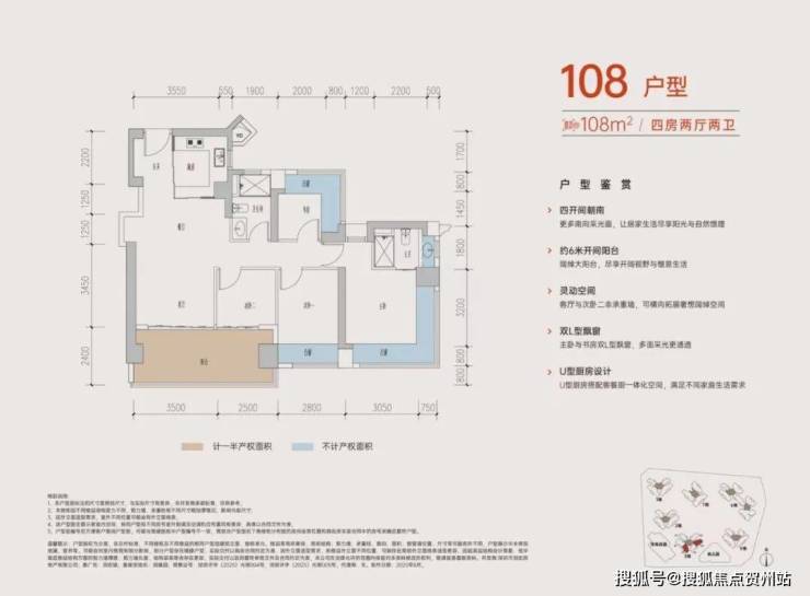 108㎡四房两卫:四开间朝南,配备约6米阔景阳台,主卧带270°L型飘窗,得房率超106%,空间尺度感强,适合三代同堂家庭。