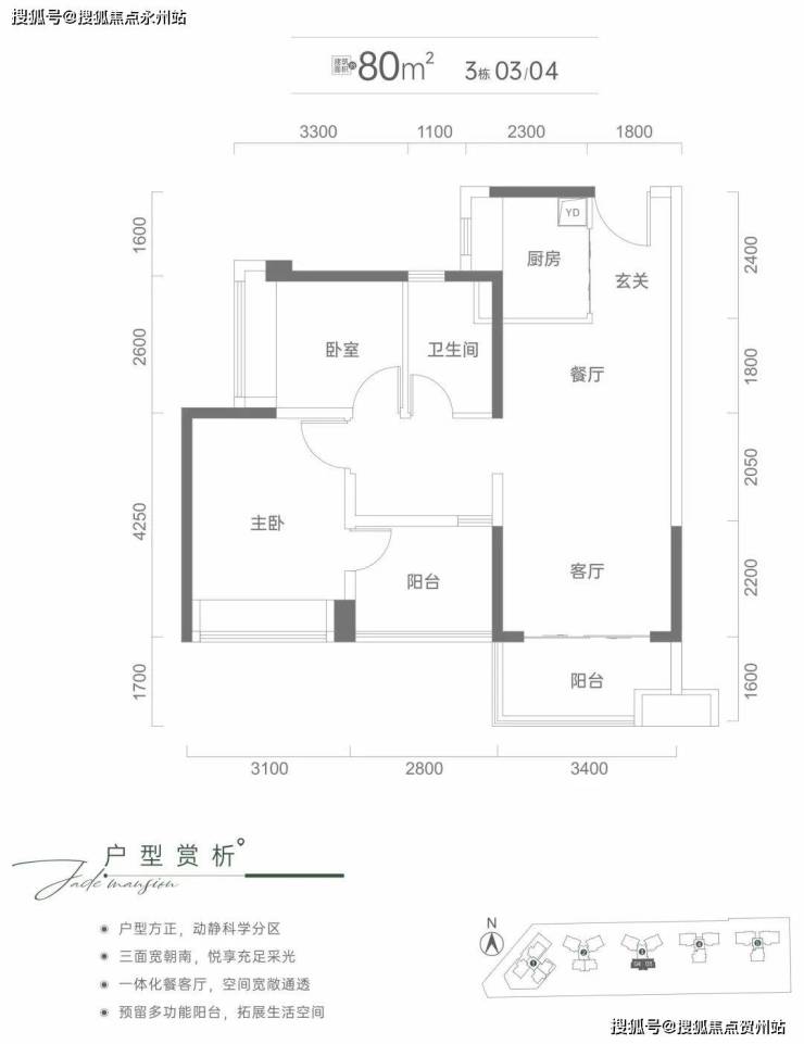 80平2+1房1卫:最小面积户型,南朝向,传统的竖厅户型动静分区格局,餐客厅18.72㎡,客厅开间3.4米,整个动区的观感应该还蛮阔绰。其中的阳台和过道需要改造成房间;主卧大小为10平米,空间算比较大,两个次卧比较平均,没有特别小的卧室,不足的地方是只有一个卫生间,客厅没有设计S墙,冰箱真不好放。厨房只有3.68平米左右,操作空间有点小整体使用率在78%左右,是南山门槛较低的上车户型。