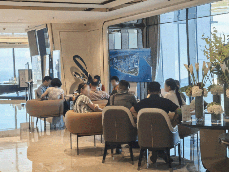 实拍所见,销售中心内人流攒动,沙盘区挤满听介绍的客户,洽谈区座无虚席。