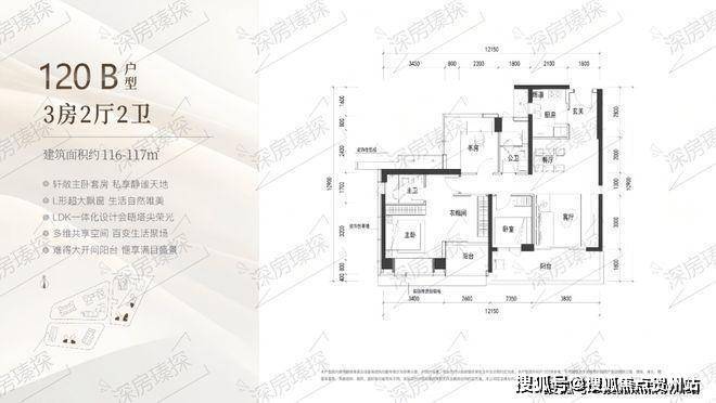 117㎡的3房2厅2卫,B户型(2栋4单元01.02.05/3栋2单元02/05户型),设计的是经典竖厅格局,客厅3.8米开间,LDKB一体化设计,3个卧室分别做到了主卧28.6㎡/次卧9.6㎡/次卧7.05㎡(包含墙体飘窗),客厅连接次卧出6.15米长的宽景大阳台,U型厨房,卫生间干湿分离, 得房率约90%(包含赠送),东南或正东朝向。其实也可以改4房。