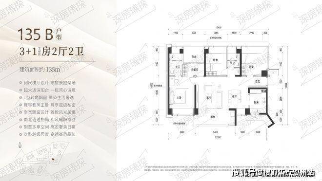135㎡的4房2厅2卫,B户型(2栋4单元06户型),设计的是横厅南北通透格局,进门入户玄关,客餐厅7.2米开间,LDKB一体化设计,四开间朝南,4个卧室分别做到了主卧19.08㎡/次卧14.3㎡/次卧11.7㎡/次卧11.7㎡(包含墙体飘窗),客厅连接次卧出6.8米长的观景大阳台看深大校区,U型厨房,卫生间干湿分离, 得房率约90%(包含赠送),阳台主朝西南向。