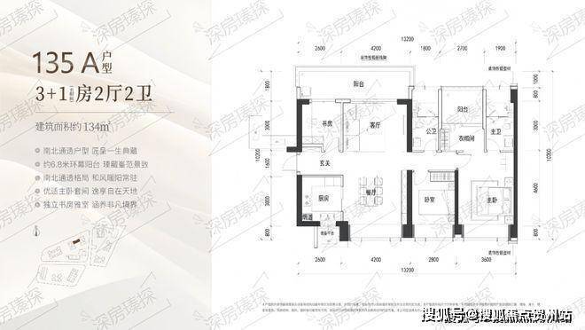 134㎡的4房2厅2卫,A户型(1栋1/2单元05户型),设计的是竖厅南北通透格局,进门入户玄关,客厅4.2米开间,LDKB一体化设计,四开间朝南,4个卧室分别做到了主卧19.44㎡/次卧10.64㎡/次卧10.26㎡/次卧7.8㎡(包含墙体飘窗),客厅连接次卧出6.8米长的观景大阳台看深大校区,U型厨房,卫生间干湿分离, 得房率约90%(包含赠送),西北朝向。