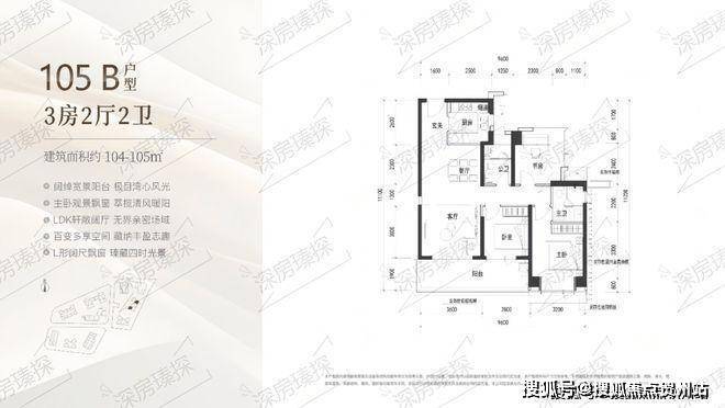 105㎡的3房2厅2卫,B户型(2栋3单元02/06户型),设计的是经典竖厅格局,客厅3.6米开间,LDKB一体化设计,三开间朝南,动静分区,3个卧室分别做到了主卧13.12㎡/次卧9.9㎡/次卧8.4㎡(包含墙体飘窗),客厅连接次卧出6.4米长的宽景大阳台,U型厨房,卫生间干湿分离, 得房率约90%(包含赠送),正南或东南朝向。
