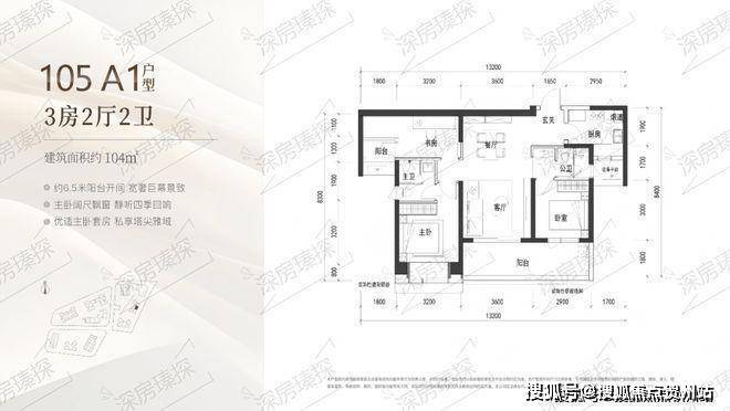 104㎡的3房2厅2卫,A1户型(2栋3单元03户型),设计的是竖厅类双龙抱珠格局,客厅3.6米开间,客餐厅一体化设计,3个卧室分别做到了主卧12.8㎡/次卧12㎡/次卧8.7㎡(包含墙体飘窗),客厅连接次卧出6.5米长的宽景大阳台,U型厨房,公卫三段式分离, 得房率约90%(包含赠送),东南朝向。