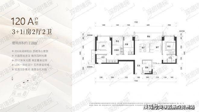 118㎡的4房2厅2卫,A户型(1栋1/2单元01户型),设计的是横厅格局,进门入户玄关,客餐厅6米开间,LDKB一体化设计,4个卧室分别做到了主卧17.65㎡/次卧11.02㎡/次卧9.12㎡/次卧8.74㎡(包含墙体飘窗),客餐厅出6米长的观景大阳台看深大校区,U型厨房,公卫三段式分离, 得房率约90%(包含赠送),西北朝向。