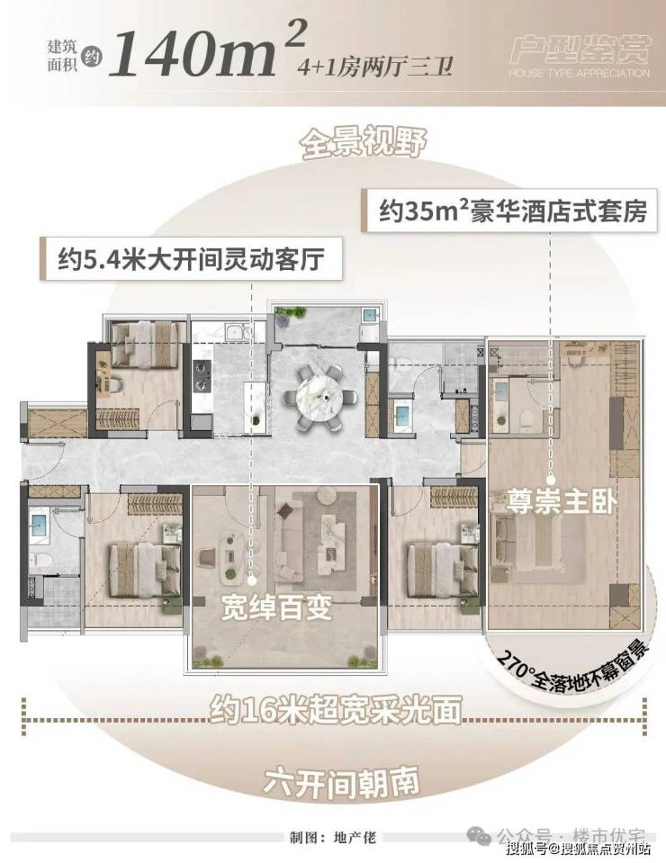——建面约140㎡4+1房两厅三卫,实用率超100%。
