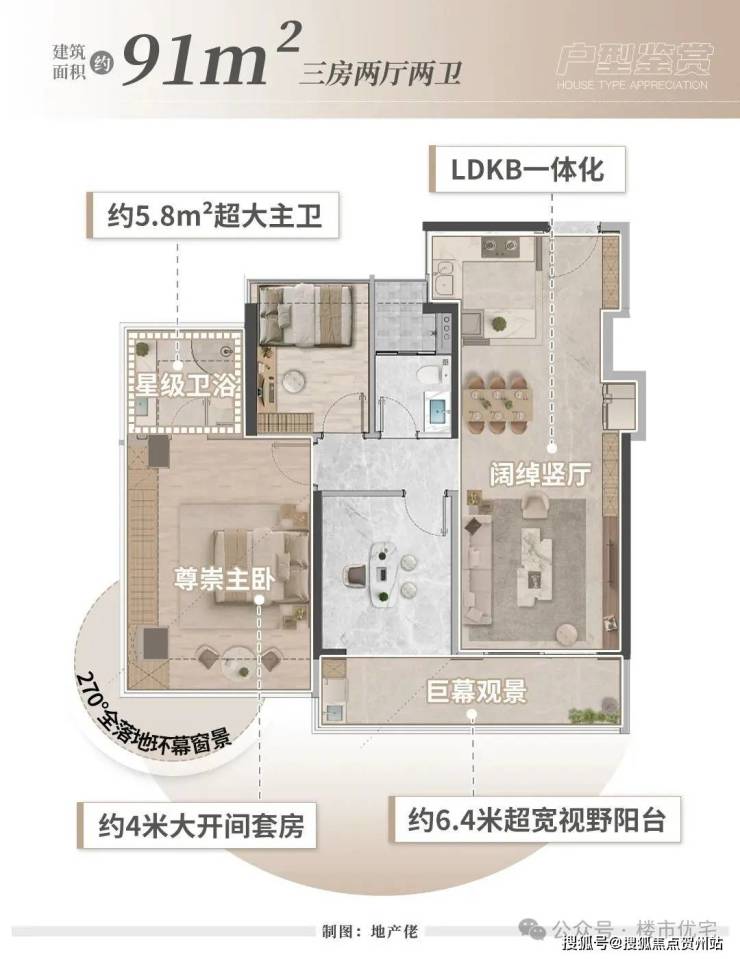 ——建面约91㎡三房两厅两卫,实用率超100%。