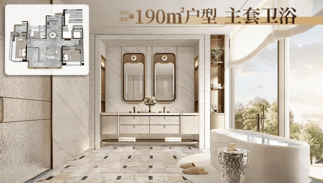 四开间朝南的双套房,主卧套房同样是270度的弧面转角窗设计。每一个卫生间,都是自然通风的全明设计。